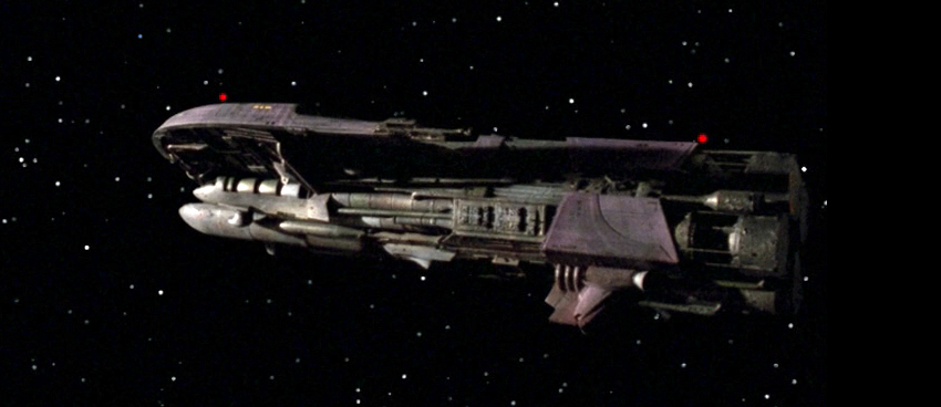 An Atlec warship alongside a Straleb warship and the overwhelmingly larger and more powerful Galaxy class Enterprise-D.